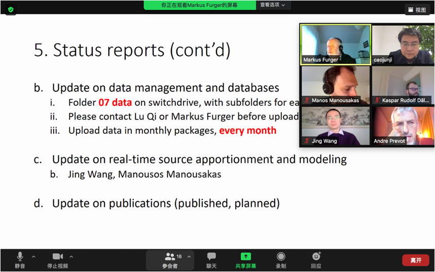 The 2nd Technical and Management Meeting of Sino-Swiss Clean Air China Project (Phase 1) was held virtually on March 5, 2021. The 1st meeting was taken place on February 4 in this year. Overall 16 participants attended the meeting, including project leaders of Dr. Andre Prevot, Prof. Jing Wang, and Prof. Junji Cao, together with other members from Paul Scherrer Institute (PSI), Swiss Federal Institute of Technology Zurich (ETH), and Institute of Earth Environment, Chinese Academy of Sciences (IEECAS). Dr. Markus Furger coordinated the meeting and gave a discussion report on the progresses and updates having been made thus far. Interactive communication and valuable inputs were made effectively by the participates with regard to the past and recent field campaigns, data management and databases, source apportionment and modelling , publications, and sharing and disseminating project results and experiences. To date, the project goes smoothly since it was started from September, 2019. Further virtual internal workshop to discuss outcomes and strengthen scientific exchange was scheduled on this May. A public virtual meeting for outreaching was also planned in fall 2021, where results will be presented to stakeholders and interested persons.