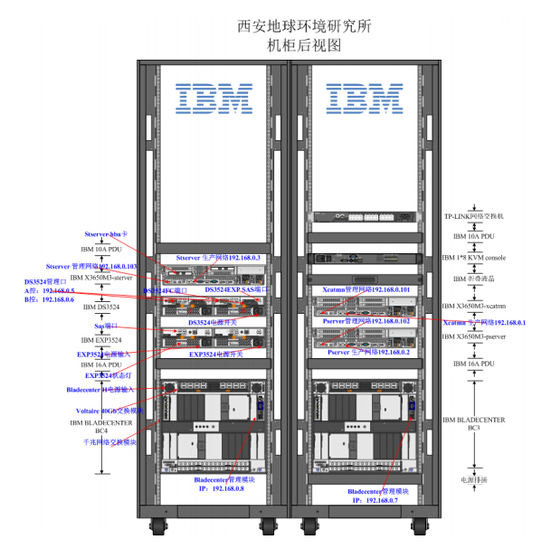 两组BCH,各包括1个L2/3 Copper以太网交换机模块/1个40GB InfiniBand。28块刀片,HS22, 2*Xeon 6C X5675 95W 3.06GHz/1333MHz/12MB, 9*4GB, 300G/Bay 2.5in SAS,40GB IB