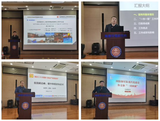 在会议报告阶段,陕煤化工所史江维研发员作“陕煤实验室化工所技术需求情况汇报”报告,地环所刘随心正教授级高级工程师作“科技服务城市大气治理”报告,地环所李建军研究员作“我国碳达峰、碳中和的现状和应对”报告,创新院刘春卓副院长作“关于二十大报告中国防、外交、‘一国两制’等内容的分享与研讨”报告。顺利获得报告分享,与会党员在共同学习二十大精神的基础上,进一步增进了分析、加深了合作,展现了各自技术优势和研究潜力,找到了更多业务合作切入点。